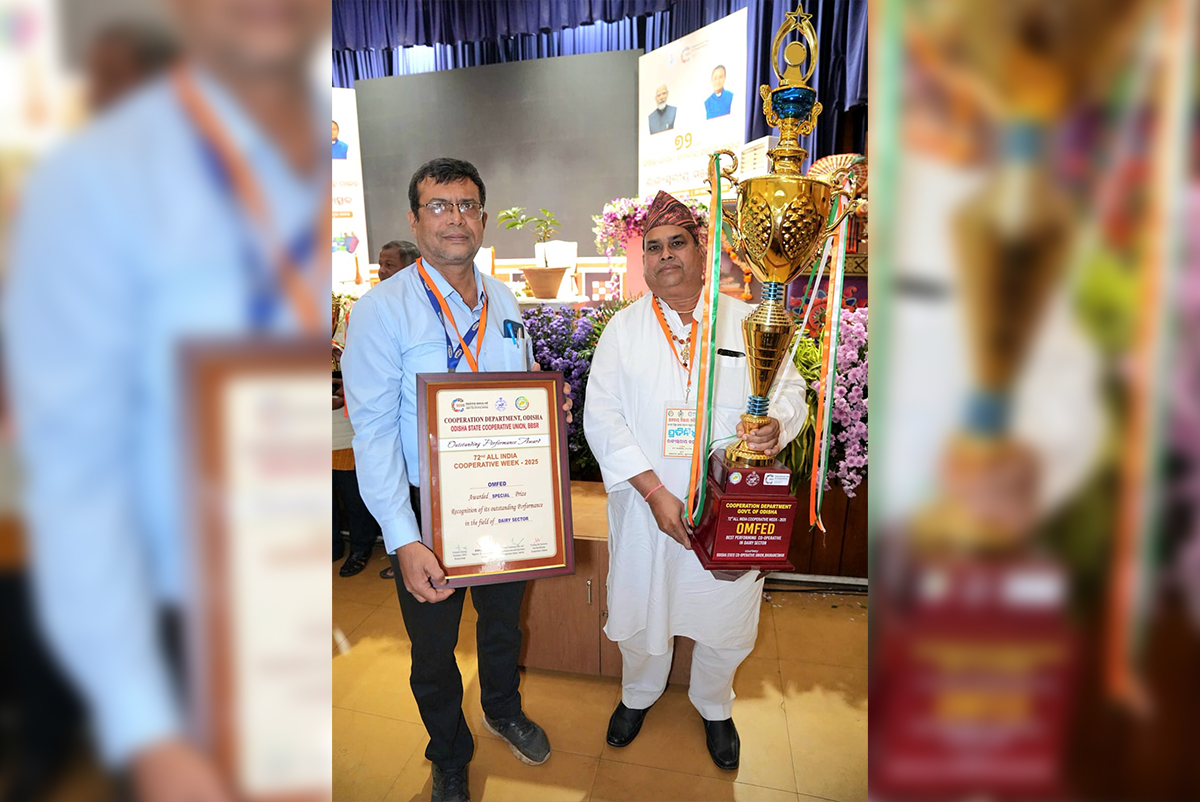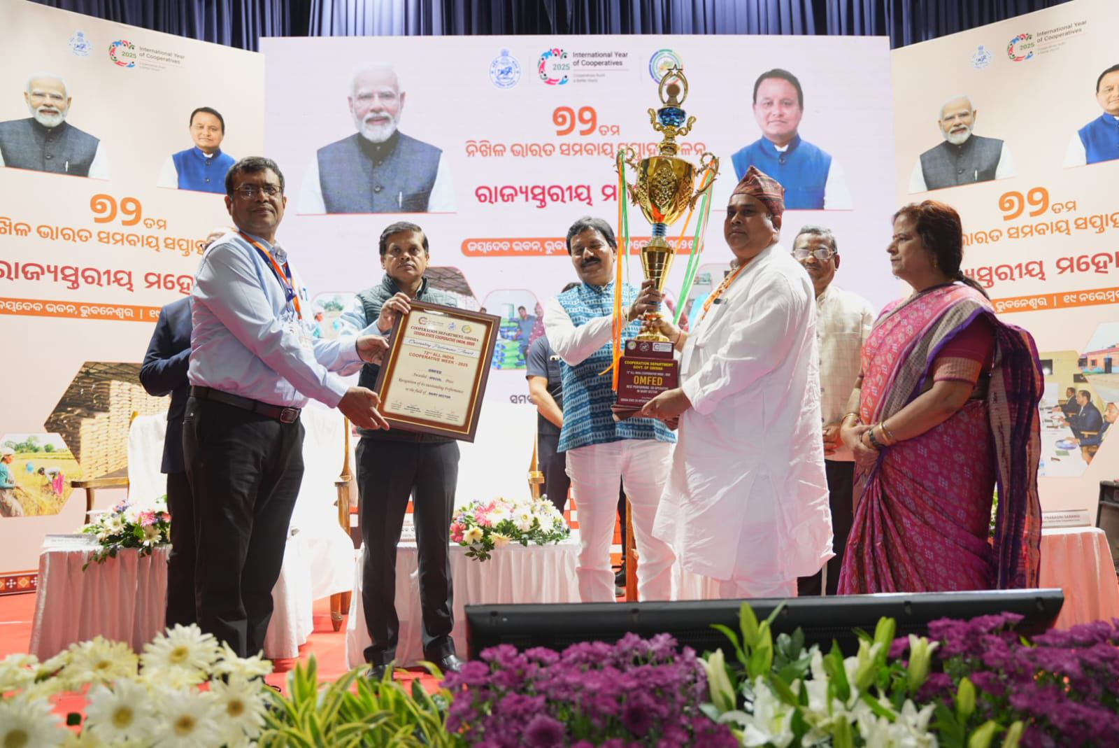 Bhubaneswar: On 19.11.2025, Omfed received a special award for its outstanding contribution to the dairy sector in the State. Omfed has been awarded this honour on the occasion of 72nd All India Cooperative Week-2025. Hon’ble Minister for Cooperation Shri Pradip Bal Samant graced the occasion as the Chief Guest and gave the awards on behalf of the State Government at a special function held at Jayadev Bhawan, Bhubaneswar on 19th Nov. 2025. Omfed President Shri Kishore Chandra Pradhan and in-charge Human Resource Development Head Shri Nityadarshan Mishra received the special cups and certificates from the guests on the dais. The meeting was attended by Principal Secretary, Cooperation, Mr. Rajesh Prabhakar Patil, Registrar of Cooperative Societies, Siddharth Das, President of Cooperative Societies Union, Prabhashini Shadangi, and General Secretary of Cooperative Societies, Santosh Kumar Nayak. The programme was attended by hundreds of people from different parts of the State, representatives of various social organisations and representatives of various Co-Operative Societies of the state.